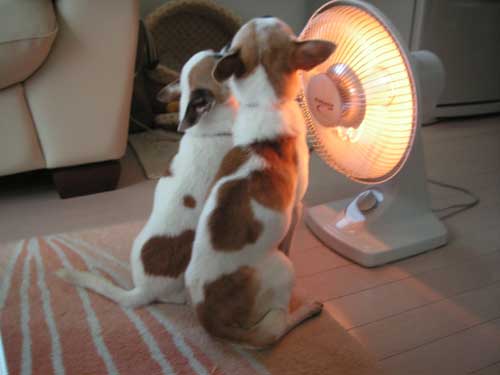 ドライヤーは、ちと苦手なチッチ&ポッポ。完全に乾かせなかったので、ヒーターを出動!